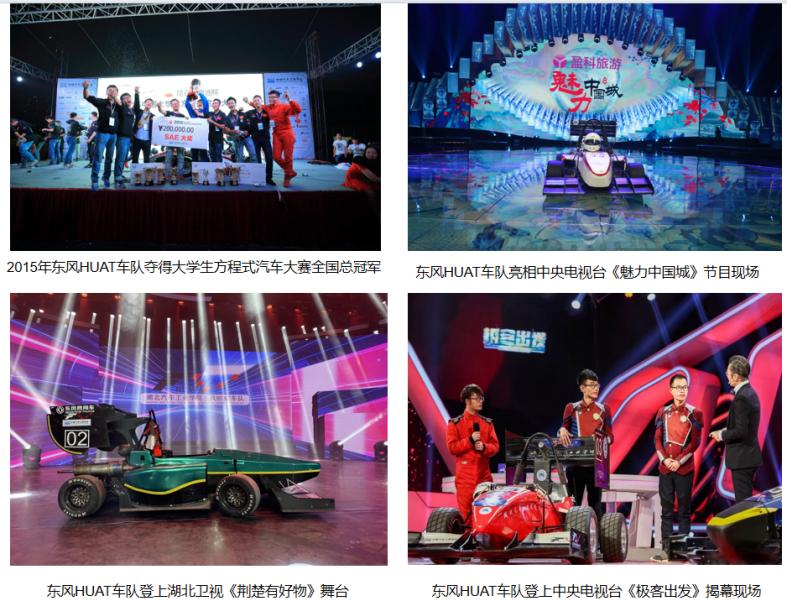 东风HUAT车队、飞翼巴哈越野车队打破专业壁垒,汇集20余个专业数百名学生,围绕赛车设计、制造、测试等领域开展科研教学活动,培养了一大批能够在赛车设计制造、车辆成本控制和研发、汽车整车调试等领域开展工作的复合型应用研究型人才。学校在中国大学生方程式系列赛事中获得3次全国总冠军,近五年获得全国一等奖7项。车队先后受邀亮相中央电视台《魅力中国城》《极客出发》,湖北卫视《荆楚有好物》等节目现场,2025年荣获“湖北青年五四奖章集体”称号。