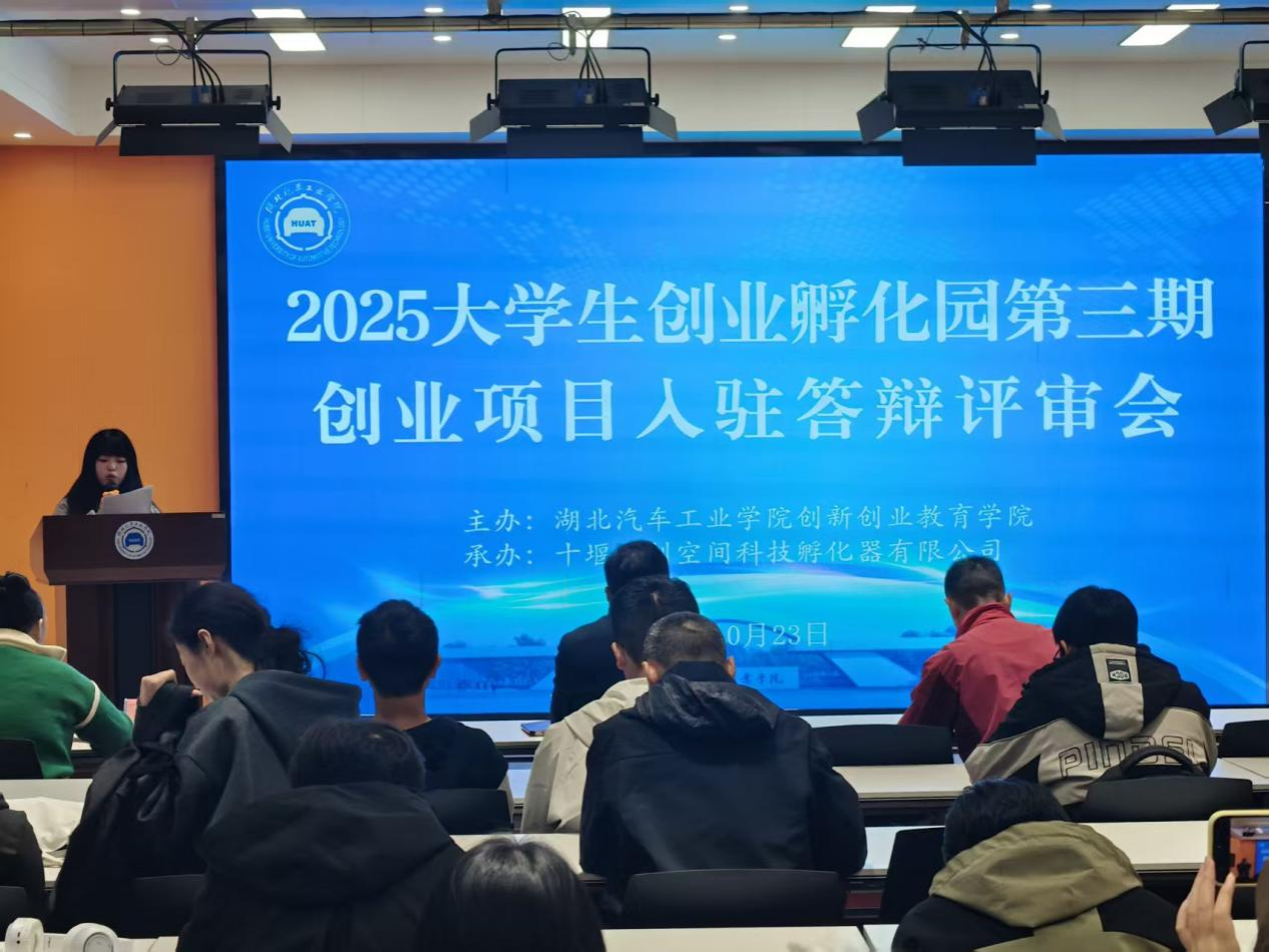 10月23日下午,湖北汽车工业学院大学生创业孵化园2025年第三期项目入驻答辩评审会在创业孵化园一楼路演厅举行。现场共有4个项目进行路演展示。校外创业导师和专家参与评审,40余名学生观摩学习。